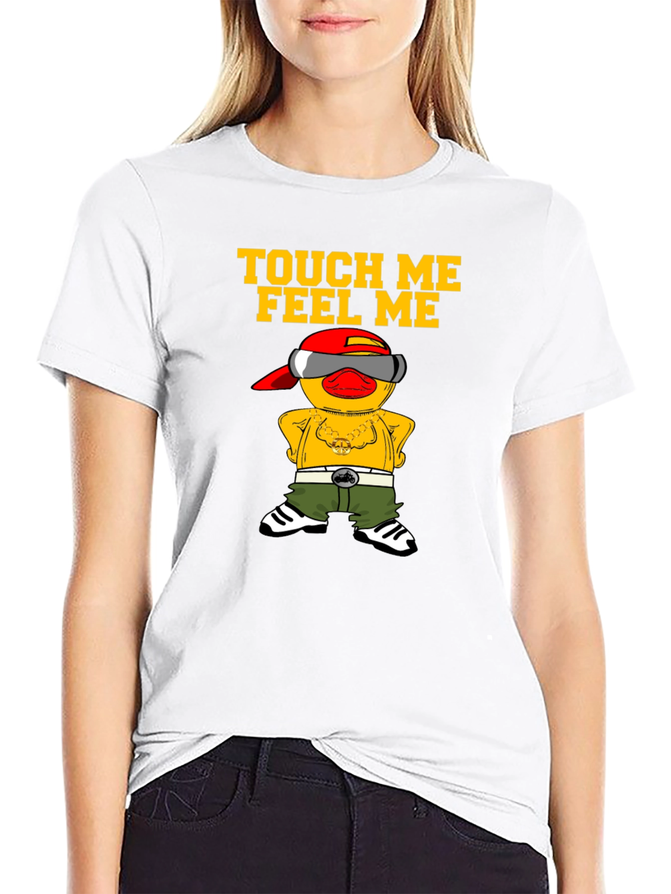 This black tee features a bold graphic of a cartoon duck wearing a red cap and sunglasses, giving off a cool and confident vibe. The tee also features the text "TOUCH ME FEEL ME" in an eye-catching gold font. The design is printed on a soft, comfortable fabric, making it perfect for everyday wear. With its unique and playful design, this tee is sure to turn heads and spark conversations. Ideal for casual outings, concerts, or just hanging out with friends. Express your individuality and add a touch of humor to your wardrobe!