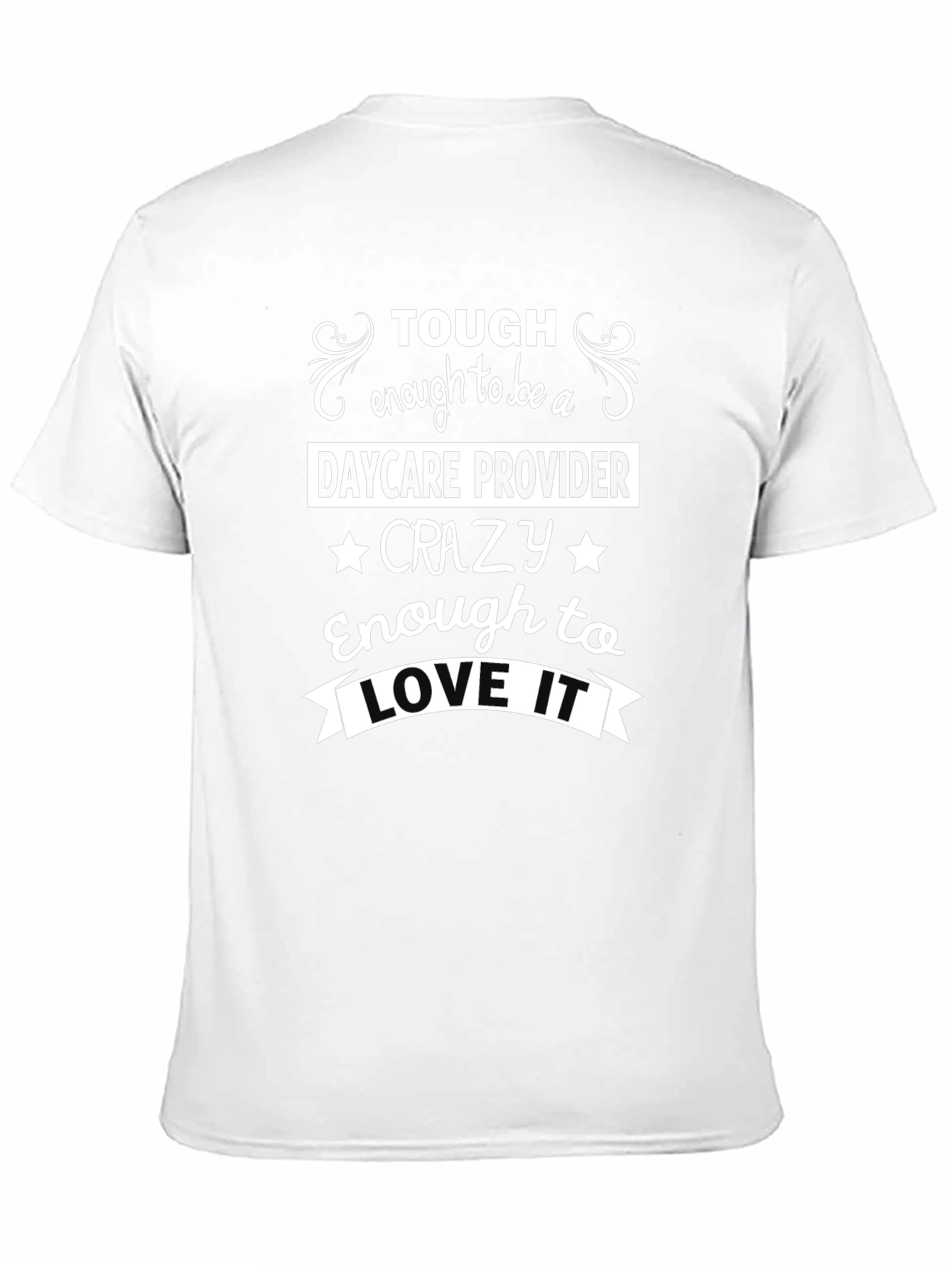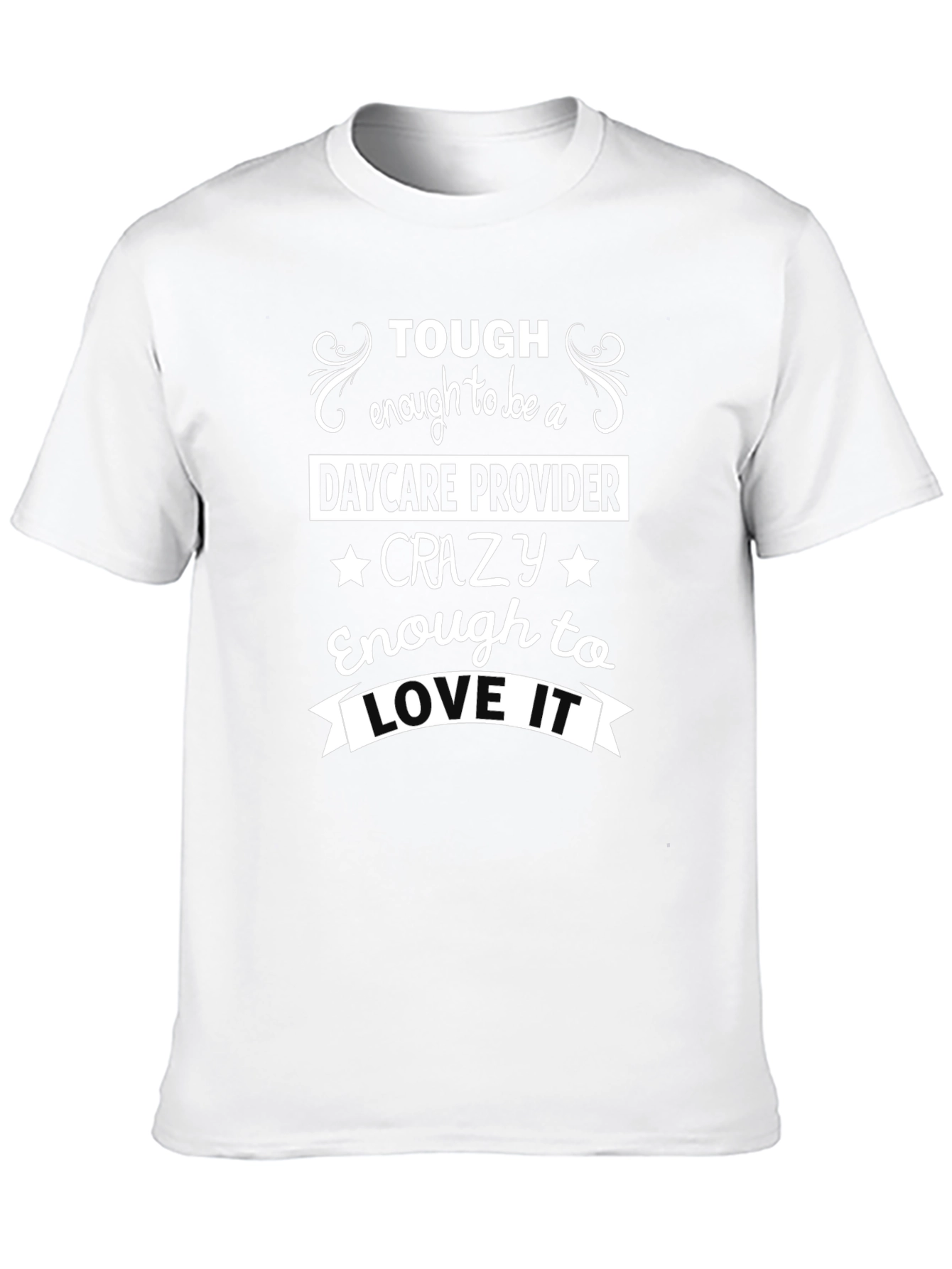 Show your dedication with this bold, black t-shirt! Featuring a playful white graphic design, it reads 'TOUGH enough to be a DAYCARE PROVIDER' and 'CRAZY enough to LOVE IT', making it the perfect way to express your passion. Made from soft, breathable fabric, it's comfortable enough for all-day wear. This shirt is ideal for daycare professionals who want to showcase their commitment and sense of humor. A fun and unique addition to your work wardrobe or a thoughtful gift for your favorite caregiver!