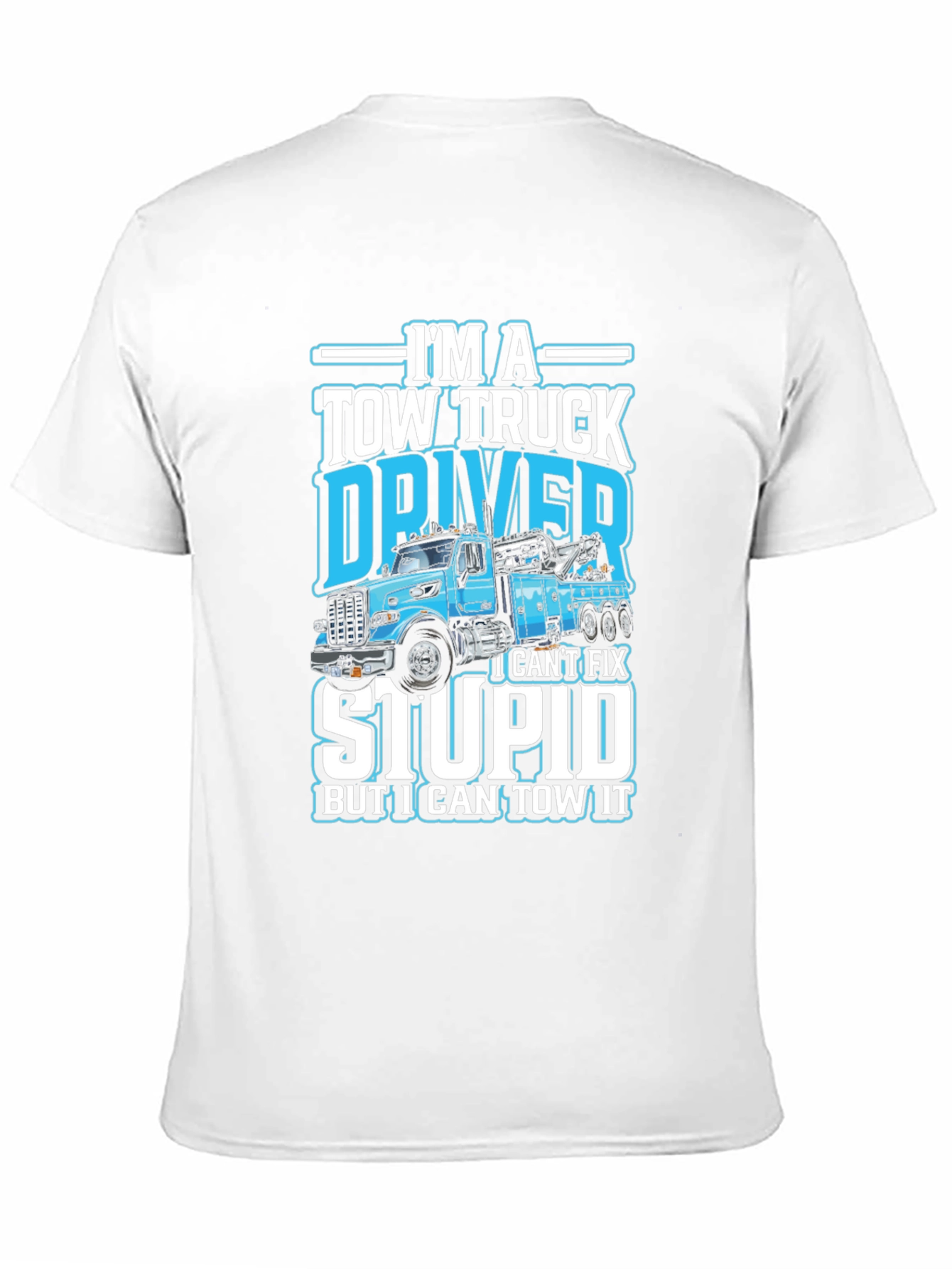 This eye-catching black cotton t-shirt features a humorous design perfect for tow truck drivers. The shirt displays a bold graphic with the text "I'M A TOW TRUCK DRIVER", "I CAN'T FIX STUPID BUT I CAN TOW IT", alongside a detailed illustration of a blue tow truck. Made from comfortable cotton material, this tee offers a relaxed fit suitable for everyday wear. Ideal for tow truck operators who enjoy a bit of wit, this shirt is a great way to showcase their profession with pride and humor. It's perfect for casual outings, work events, or as a fun gift for the tow truck driver in your life.