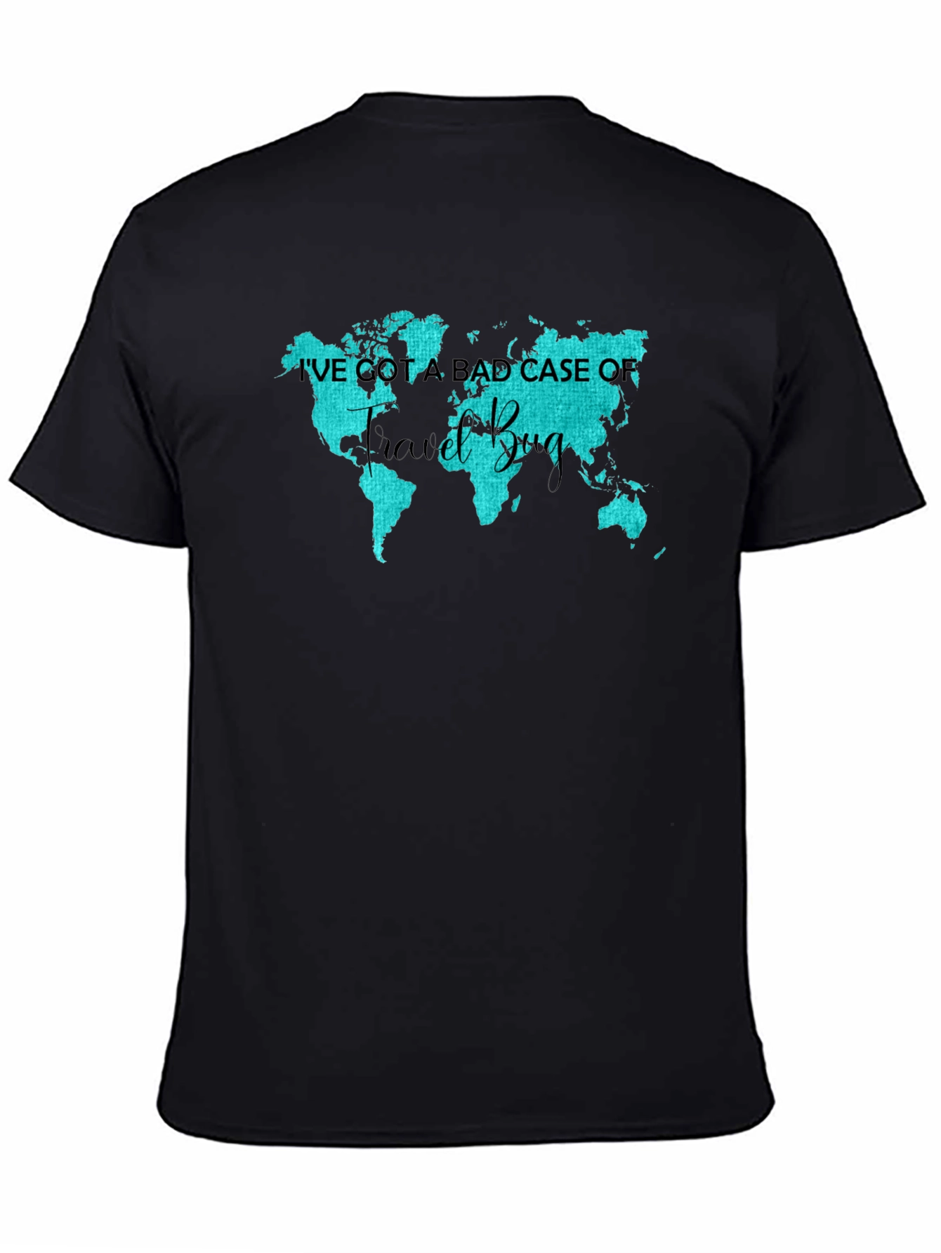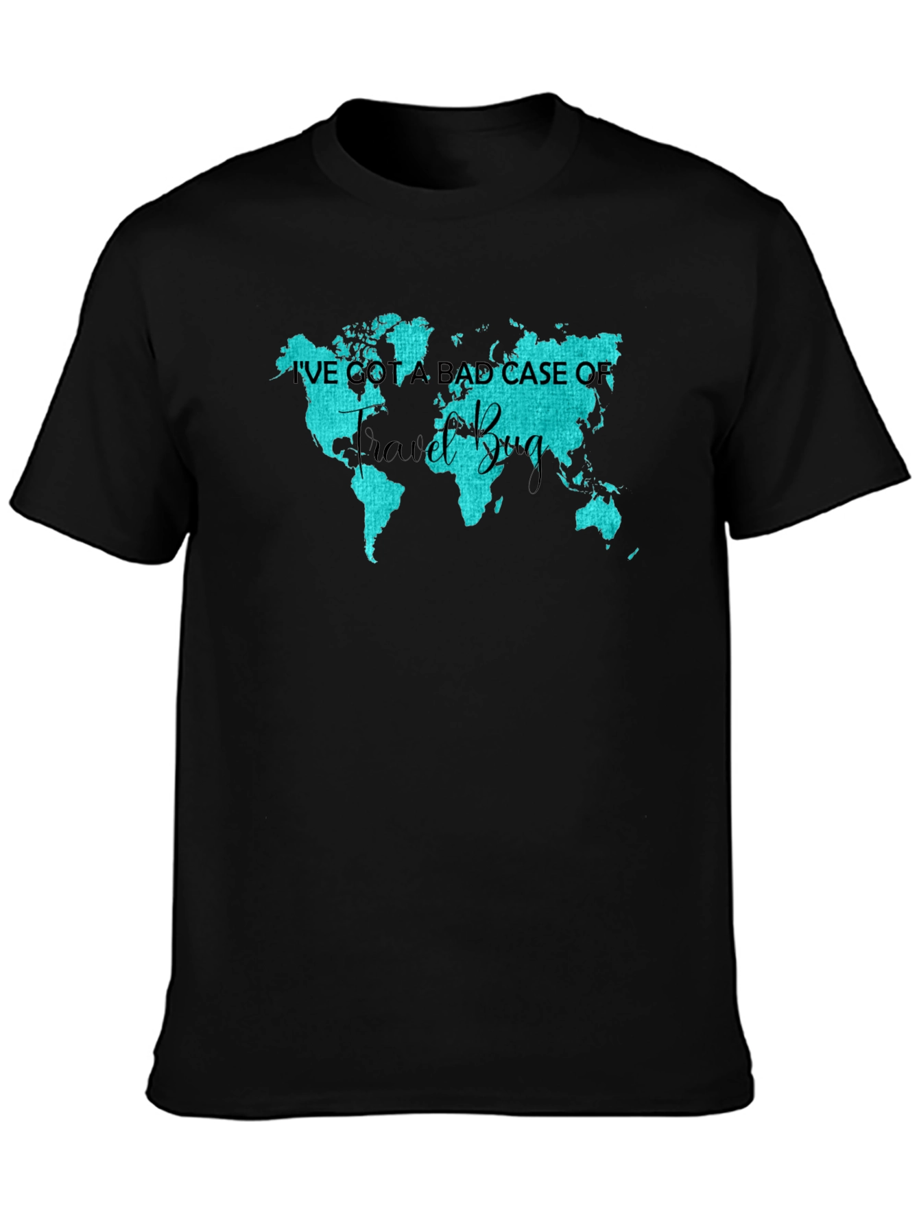 Embrace your wanderlust with this unique black T-shirt featuring a turquoise world map graphic. The text overlay, "I've Got A Bad Case of Travel Bug," captures the spirit of adventure. Crafted from a comfortable, breathable fabric, this tee is perfect for travel enthusiasts. The vibrant map print stands out against the dark background, making a bold statement. Dress it up or down; this shirt is suitable for casual outings, travel adventures, or everyday wear. Show off your love for exploration with this one-of-a-kind T-shirt!