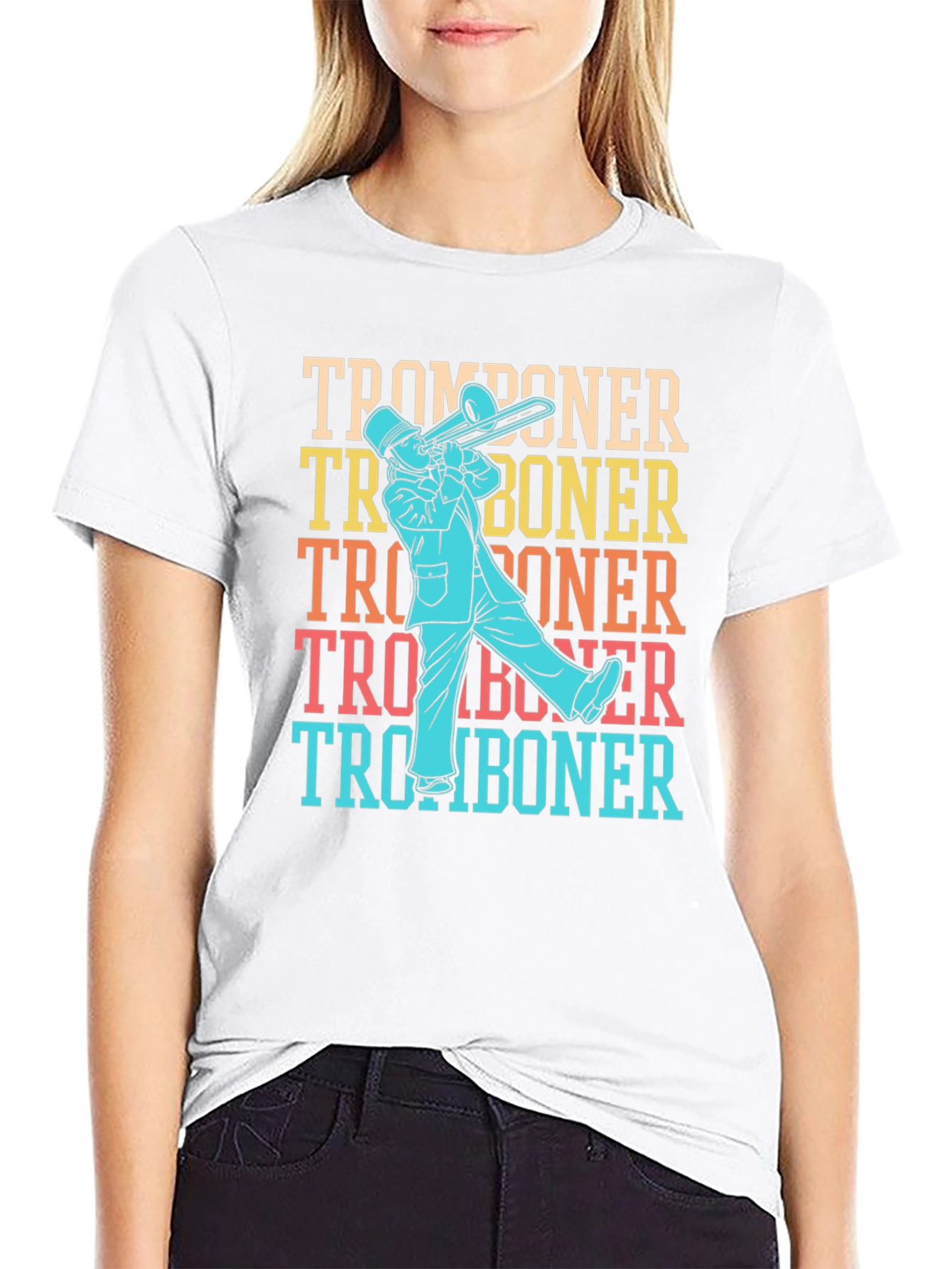 Show off your love for music with this Tromboner retro t-shirt. This tee features a vintage-inspired design with the word "Tromboner" repeated in faded, stacked colors. A cool graphic of a person playing the trombone adds a unique touch. Made from comfortable black cotton, this shirt is perfect for musicians, band members, or anyone who appreciates a touch of musical humor. Ideal for casual wear, concerts, or band practice. Get yours today!