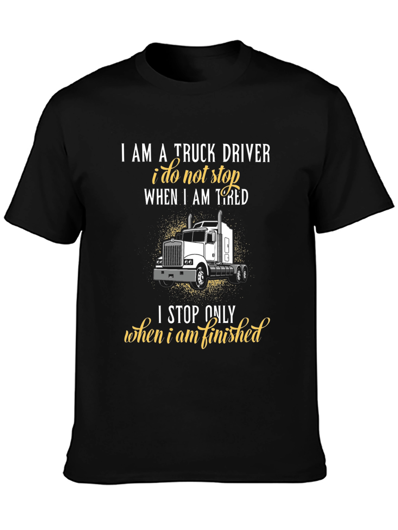 Show off your pride as a truck driver with this bold graphic t-shirt. The design features a detailed image of a big rig truck, with the humorous and relatable saying "I AM A TRUCK DRIVER. I do not stop when I am tired. I stop only when I am finished." The shirt appears to be made from a comfortable, soft black fabric. Perfect for wearing on the road, at truck stops, or just relaxing at home. This tee is a great gift for any dedicated trucker. Get yours today and let everyone know you're in it for the long haul!