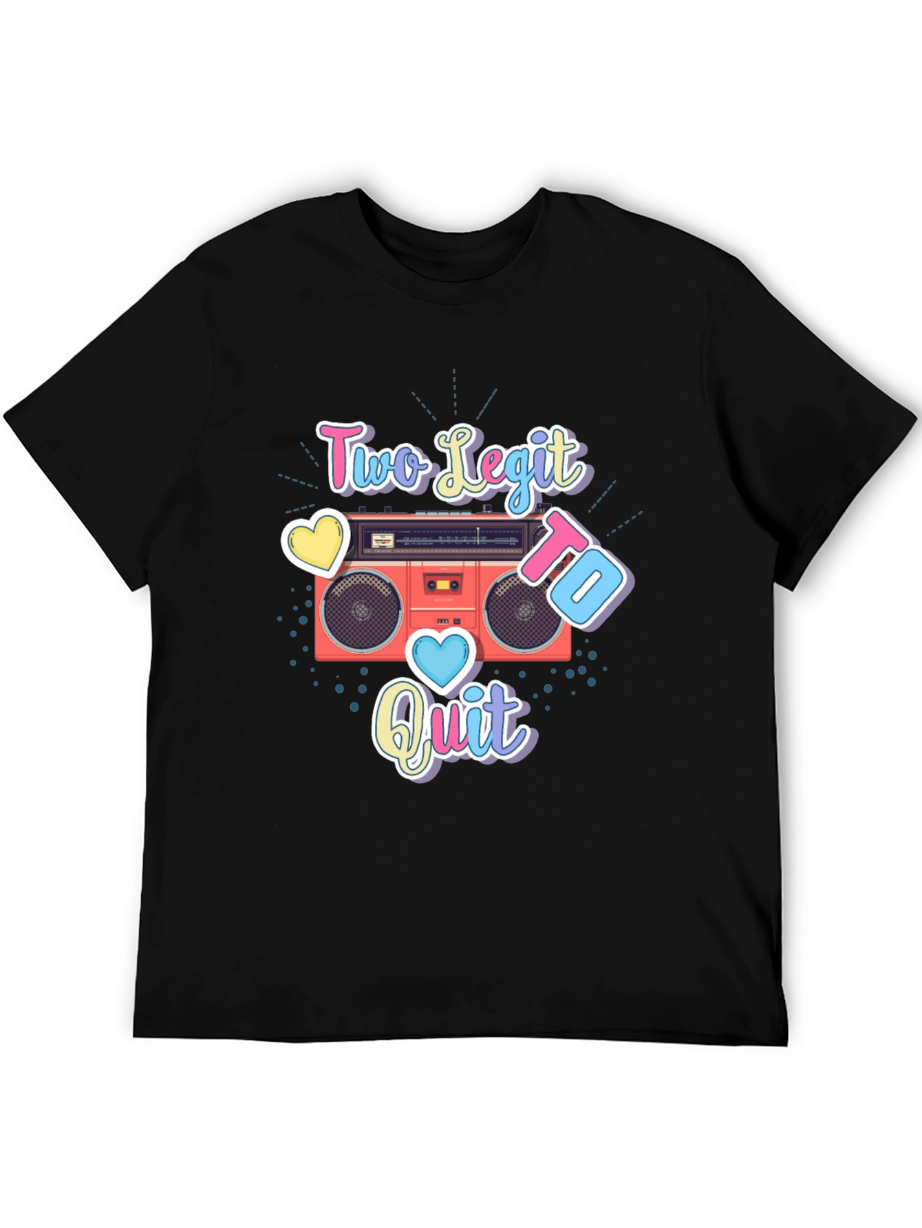 Show off your love for classic hip-hop with this vibrant "Two Legit To Quit" graphic tee! Featuring a retro boombox design surrounded by playful hearts and colorful lettering, this black t-shirt is a stylish nod to the iconic phrase. Made from a comfortable-looking fabric, this tee is perfect for casual outings, music events, or simply lounging around in style. The eye-catching design is sure to spark conversation and bring a touch of nostalgia to your wardrobe. A must-have for music lovers and those who appreciate a fun, retro vibe!