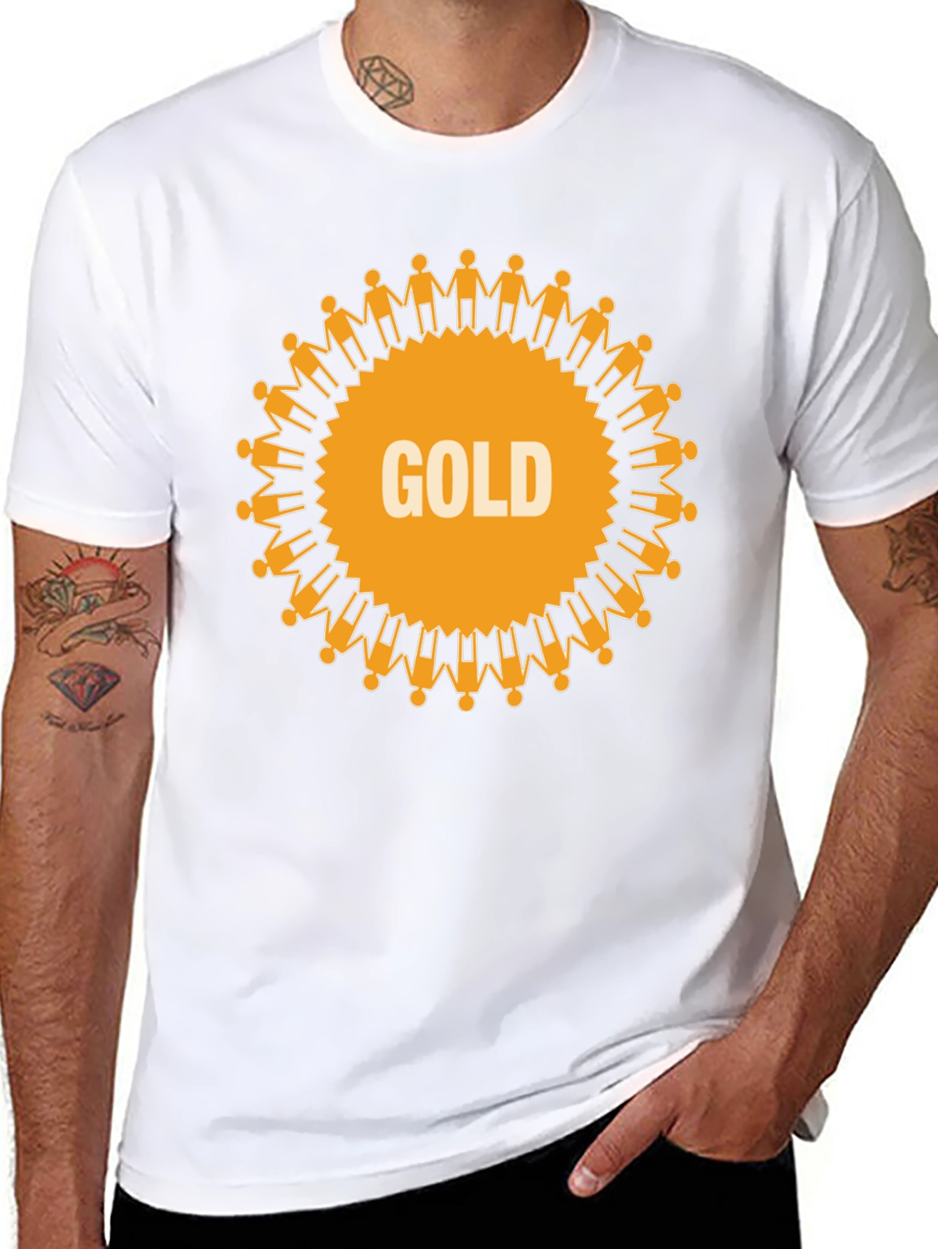 Showcase your belief in global unity with this eye-catching black tee! A vibrant gold circle, made of interconnected human figures, surrounds the word "GOLD". The design is printed on a classic-fit black t-shirt. The bright gold provides a striking contrast, making this shirt a standout piece. Perfect for casual wear, community events, or as a unique gift for someone who values cooperation. Made from a comfortable, breathable fabric, it's ideal for everyday wear. Let this shirt be a symbol of your commitment to togetherness and the value of human connection.