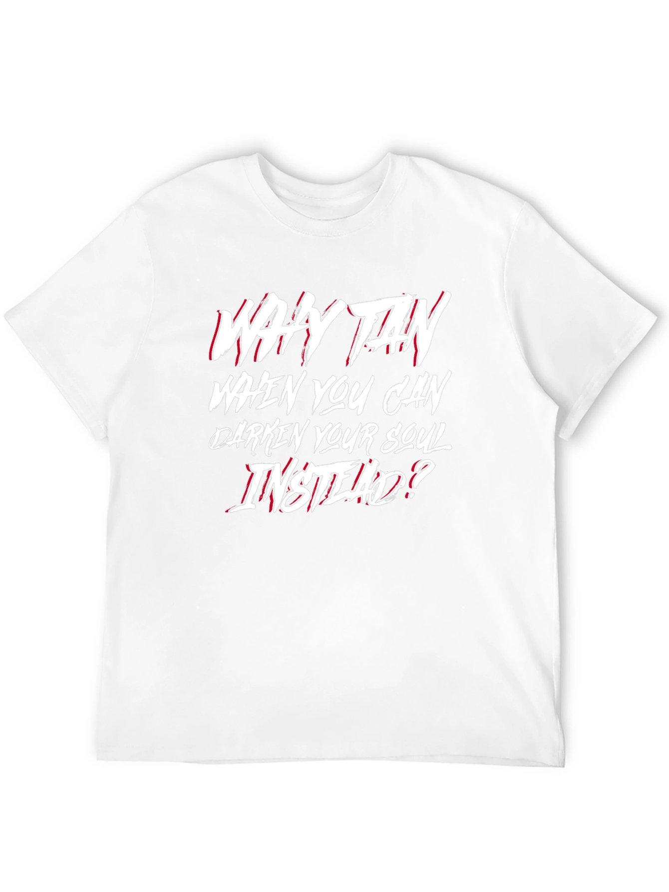 Embrace your inner darkness with this bold black t-shirt featuring the witty phrase, "Why Tan When You Can Darken Your Soul Instead?" in a striking white and red graphic. Made from a comfortable-looking cotton blend, this tee offers a relaxed fit perfect for everyday wear. The clever design makes it a great conversation starter and a unique addition to your wardrobe. Ideal for casual outings, concerts, or lounging at home, this t-shirt adds a touch of edgy humor to any outfit. Express your individuality and stand out from the crowd with this darkly funny graphic tee!