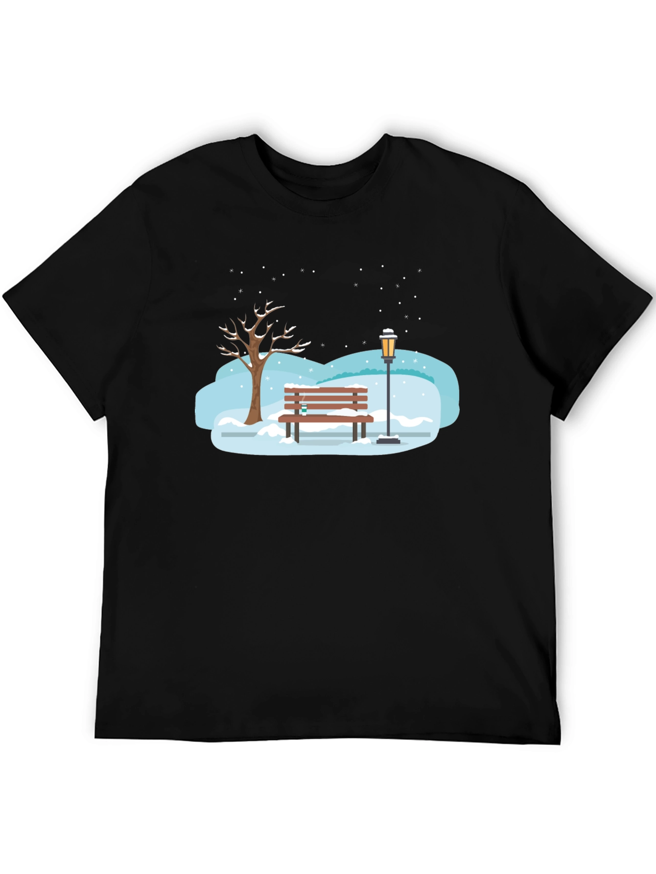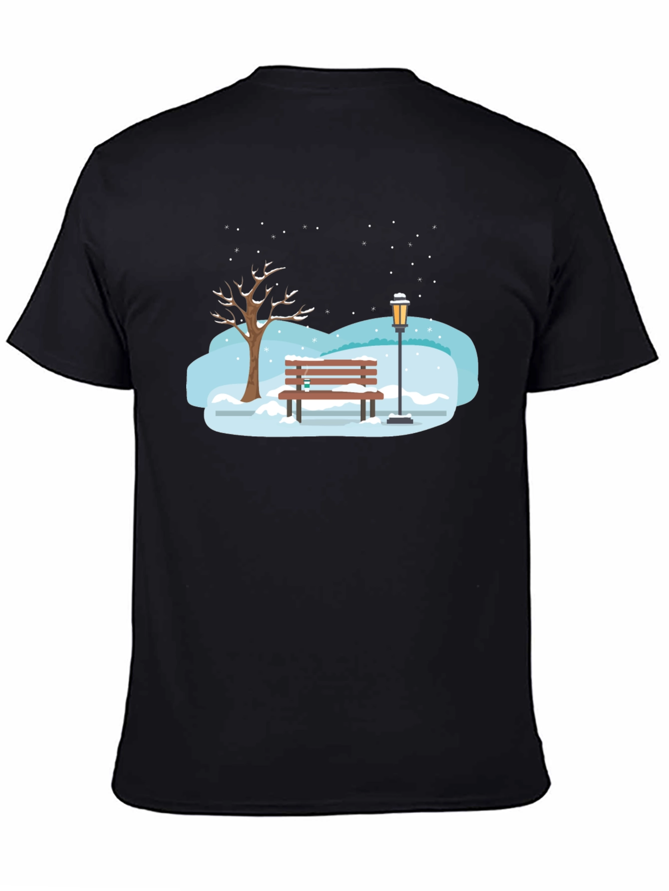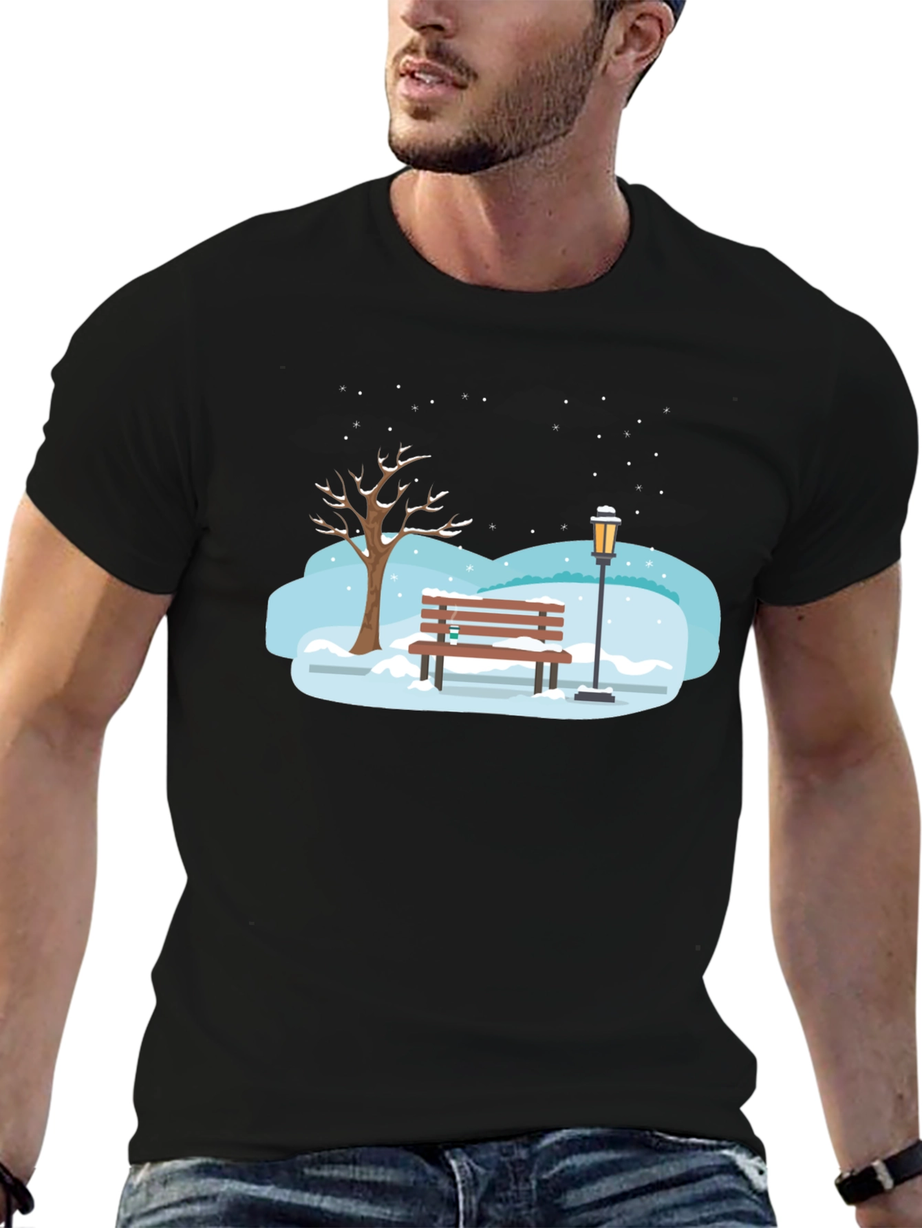 Embrace the cozy winter vibes with this stylish black graphic tee. This comfortable t-shirt features a unique illustration of a snow-covered park scene, complete with a wooden bench, bare tree, and vintage lamppost under a starry sky. The design evokes a serene and peaceful feeling, perfect for casual wear during the colder months. Made from soft, breathable fabric, this t-shirt offers all-day comfort and durability. Ideal for layering or wearing on its own, it's a versatile addition to any wardrobe. Show off your love for winter and unique style with this eye-catching tee.