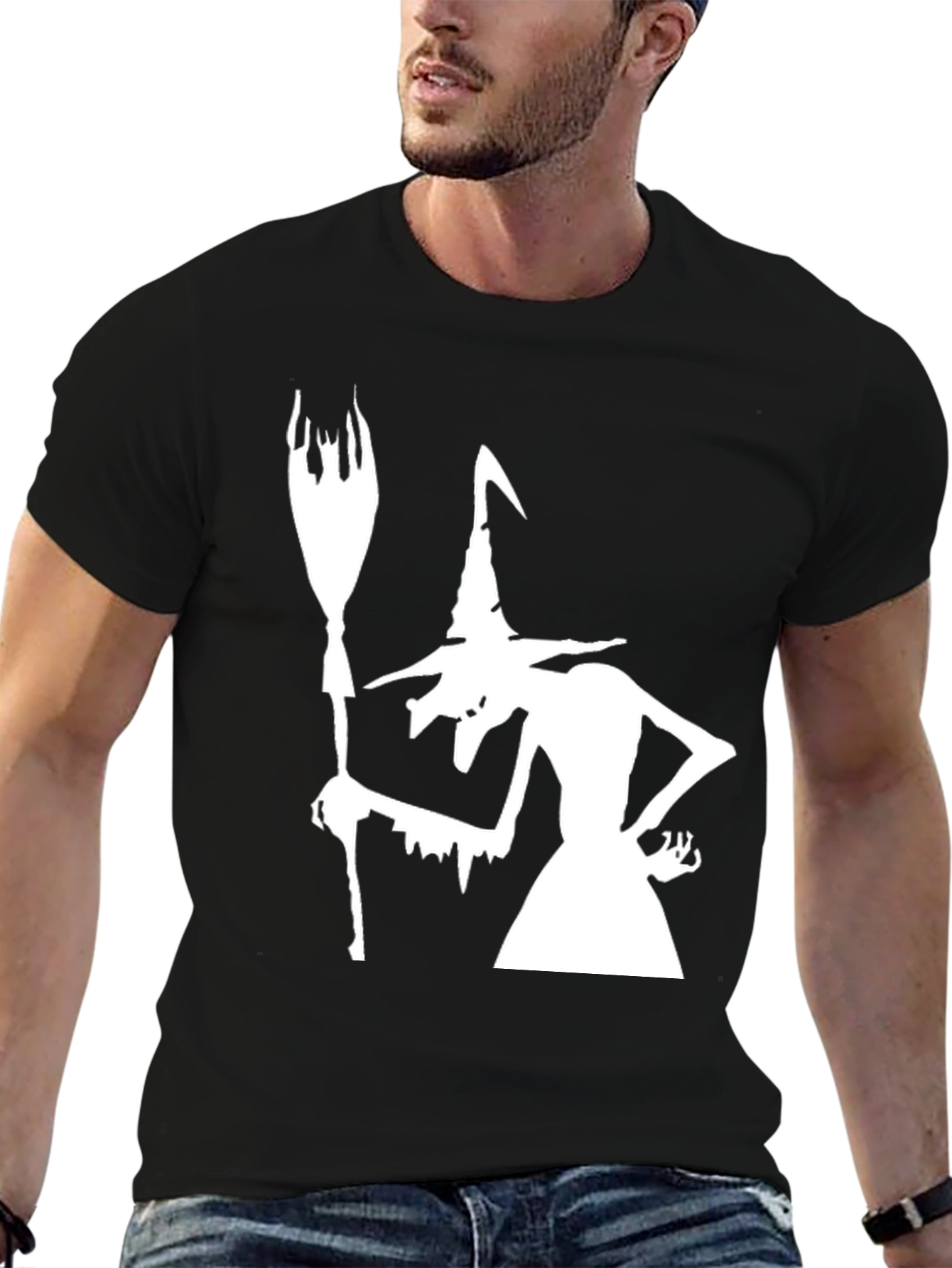 Embrace the spooky season with this stylish black t-shirt featuring a bold, white graphic of a classic witch. The design showcases a slender witch silhouette holding a broom, perfect for Halloween parties or casual wear. Made from a comfortable cotton blend, this tee offers a relaxed fit for everyday wear. Show off your Halloween spirit with this eye-catching and unique tee. This shirt is sure to be a conversation starter, making it an ideal addition to your wardrobe. Get yours today and celebrate Halloween in style!