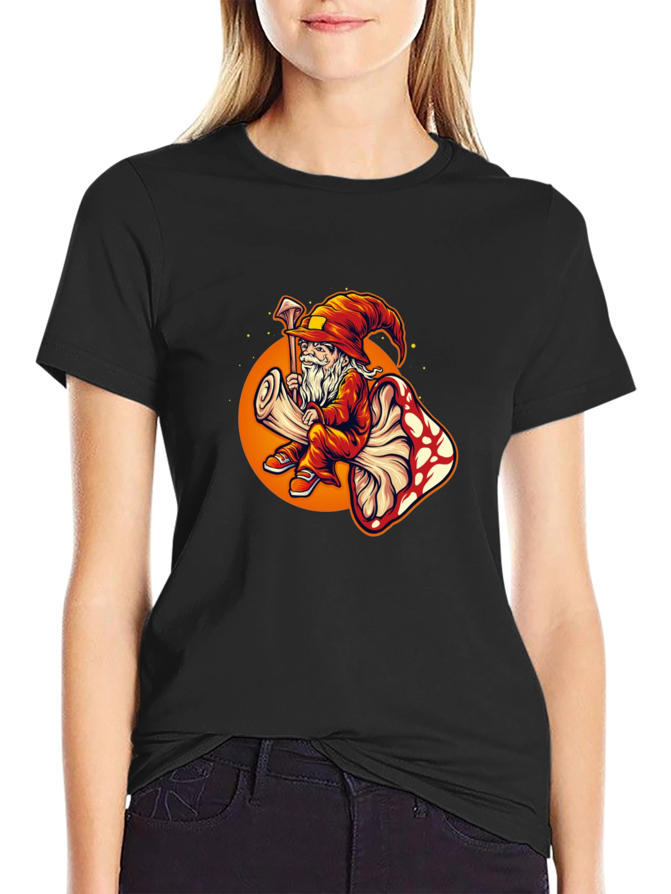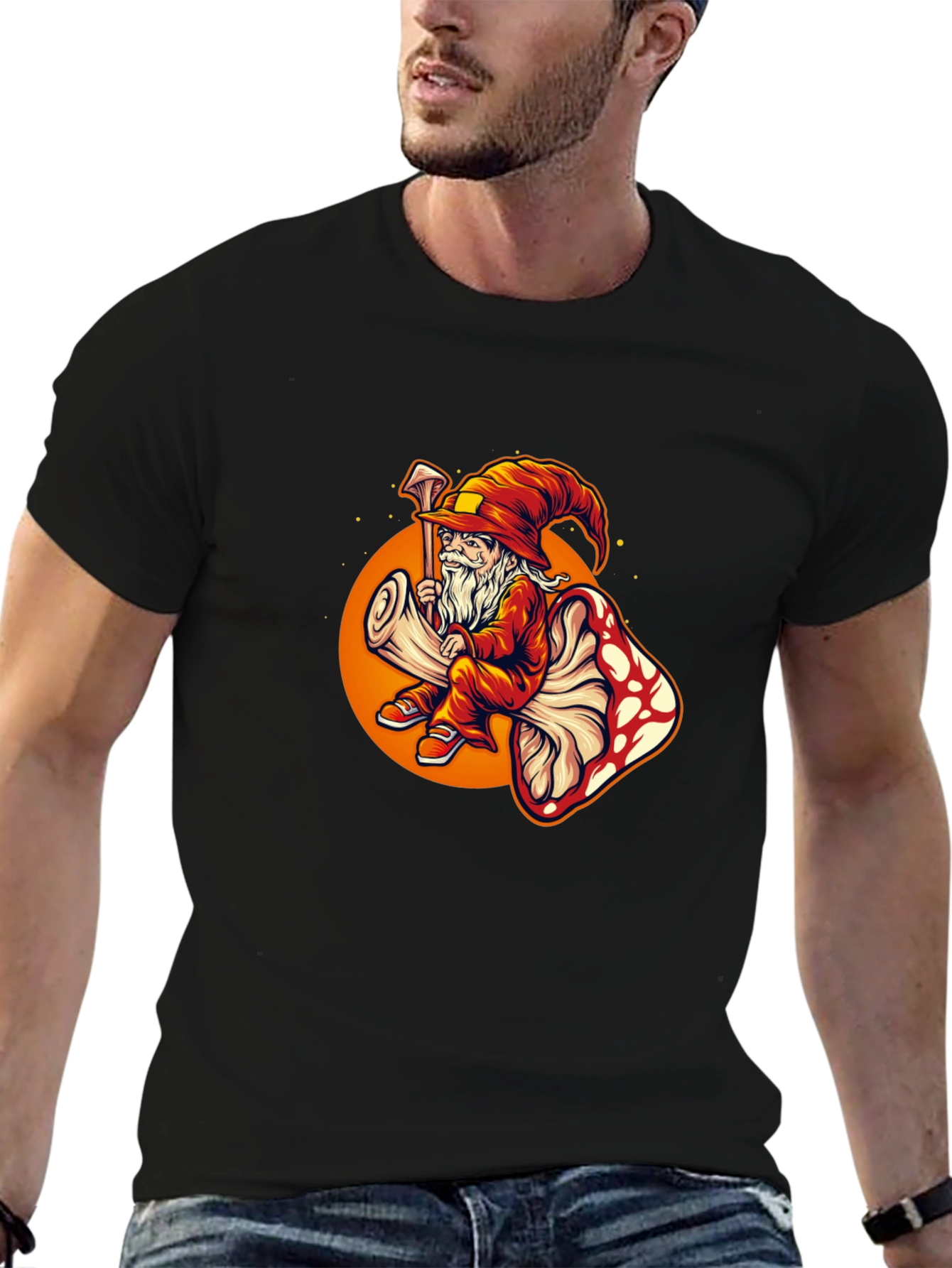 Show off your unique style with this eye-catching graphic tee! This black t-shirt features a vibrant and detailed print of a wizard sitting atop a mushroom, surrounded by a warm orange glow. The whimsical design is sure to turn heads and spark conversations. Made from what appears to be a comfortable and durable fabric, this tee is perfect for everyday wear. Whether you're heading out for a casual hangout, expressing your love for fantasy art, or looking for a standout piece, this wizard mushroom tee is an excellent choice. Add a touch of magic to your wardrobe!