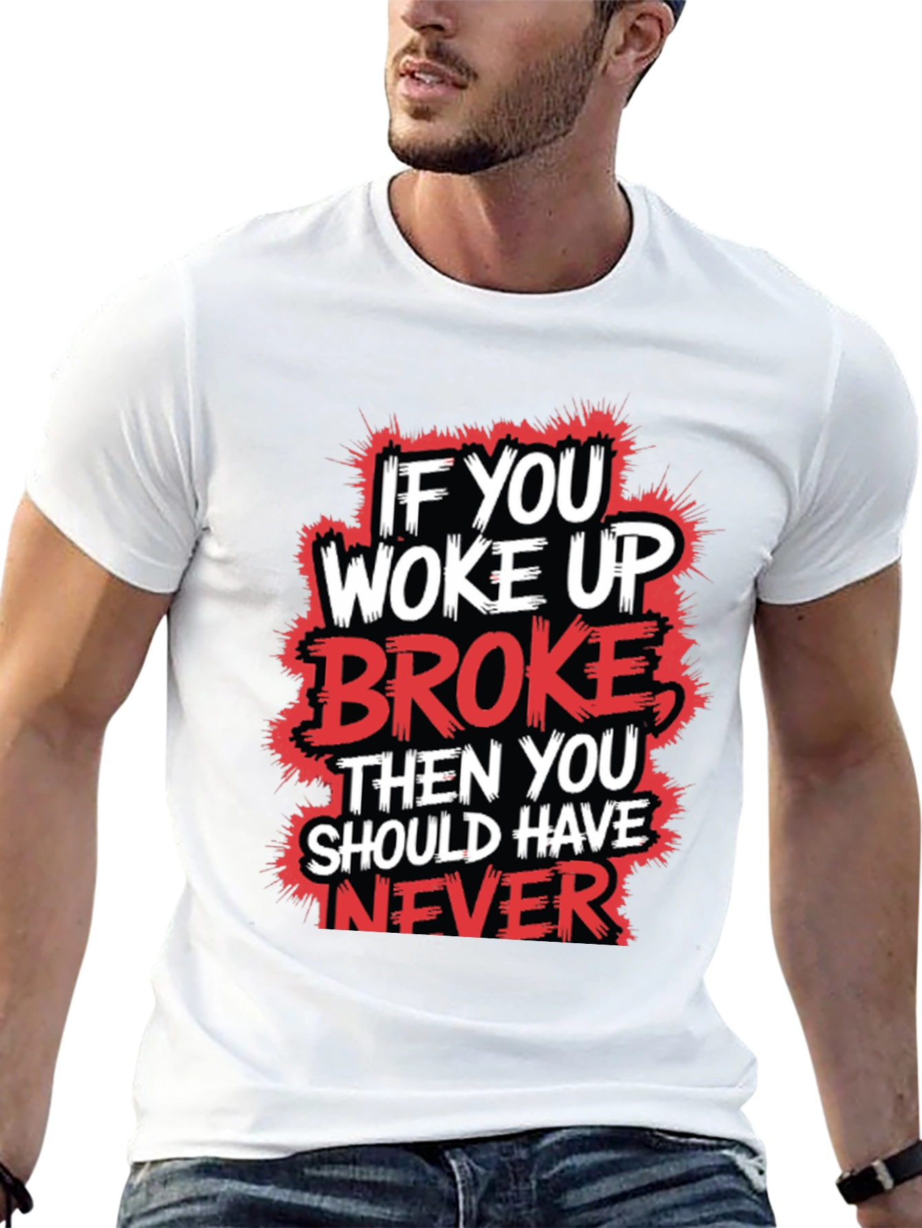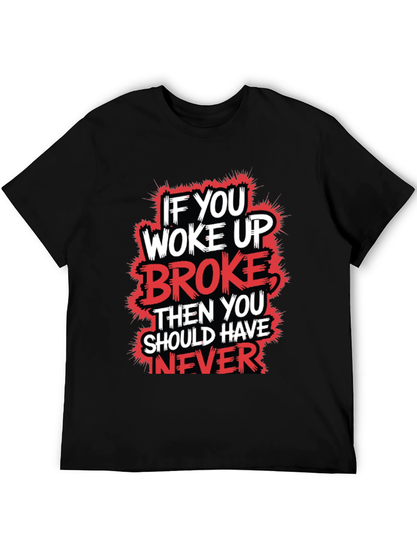 Make a statement with this bold graphic t-shirt. The design features the phrase "IF YOU WOKE UP BROKE THEN YOU SHOULD HAVE NEVER" in striking white and red lettering with a grunge outline. This eye-catching design stands out against the black cotton fabric, making it perfect for casual outings, workouts, or relaxed days at home. The shirt is crafted from soft, breathable material, ensuring a comfortable fit. Show off your unique style while making a memorable statement with this tee.