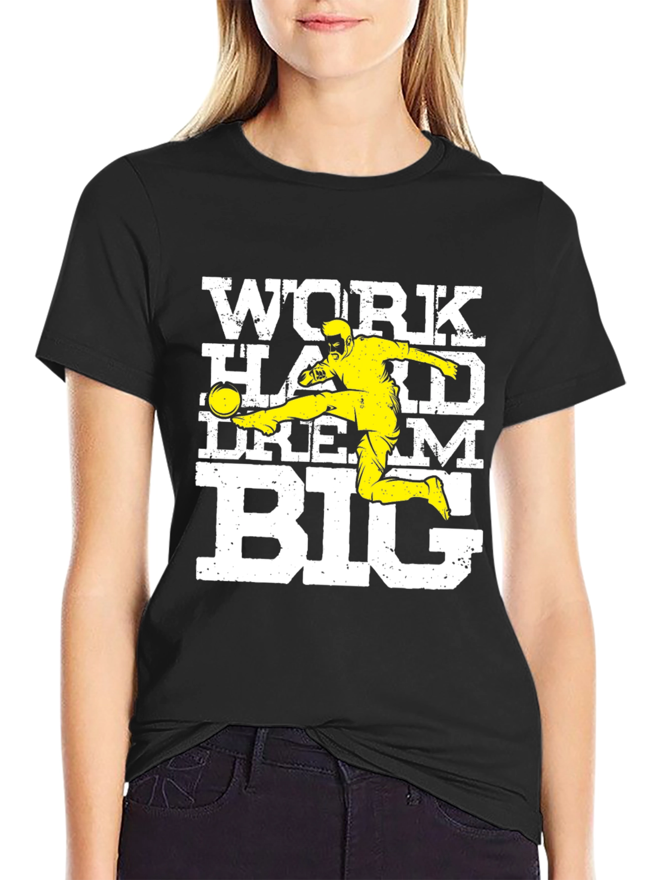 Show your passion for sports with this motivational t-shirt! This black tee features a bold graphic design with a soccer player silhouette set against the words "WORK HARD DREAM BIG" in a distressed white font. Made from a comfortable-looking fabric, this shirt is perfect for everyday wear or hitting the gym. Inspire yourself and others with this stylish and empowering tee. Great for athletes, coaches, or anyone who needs a reminder to chase their dreams. Get yours today!