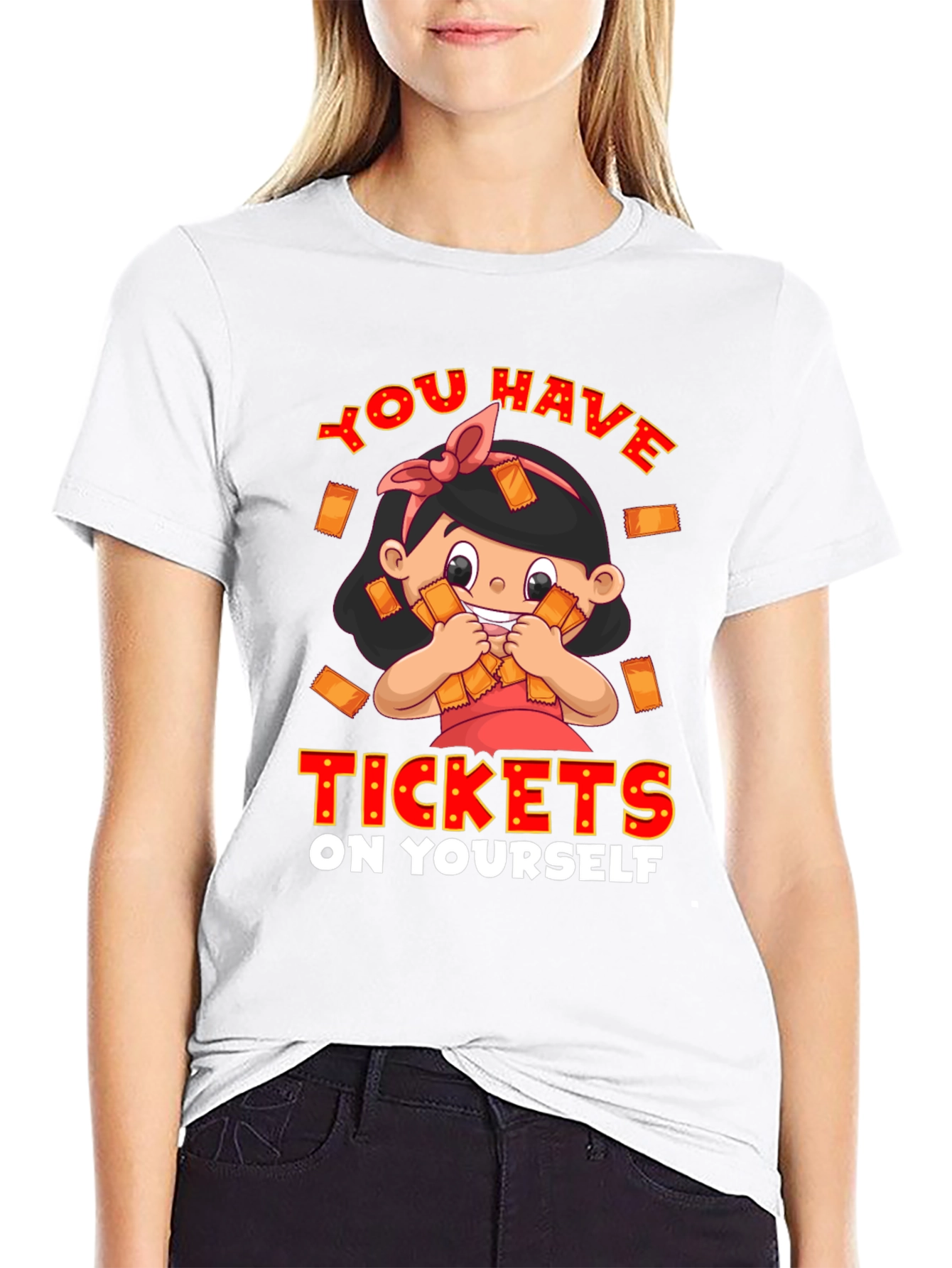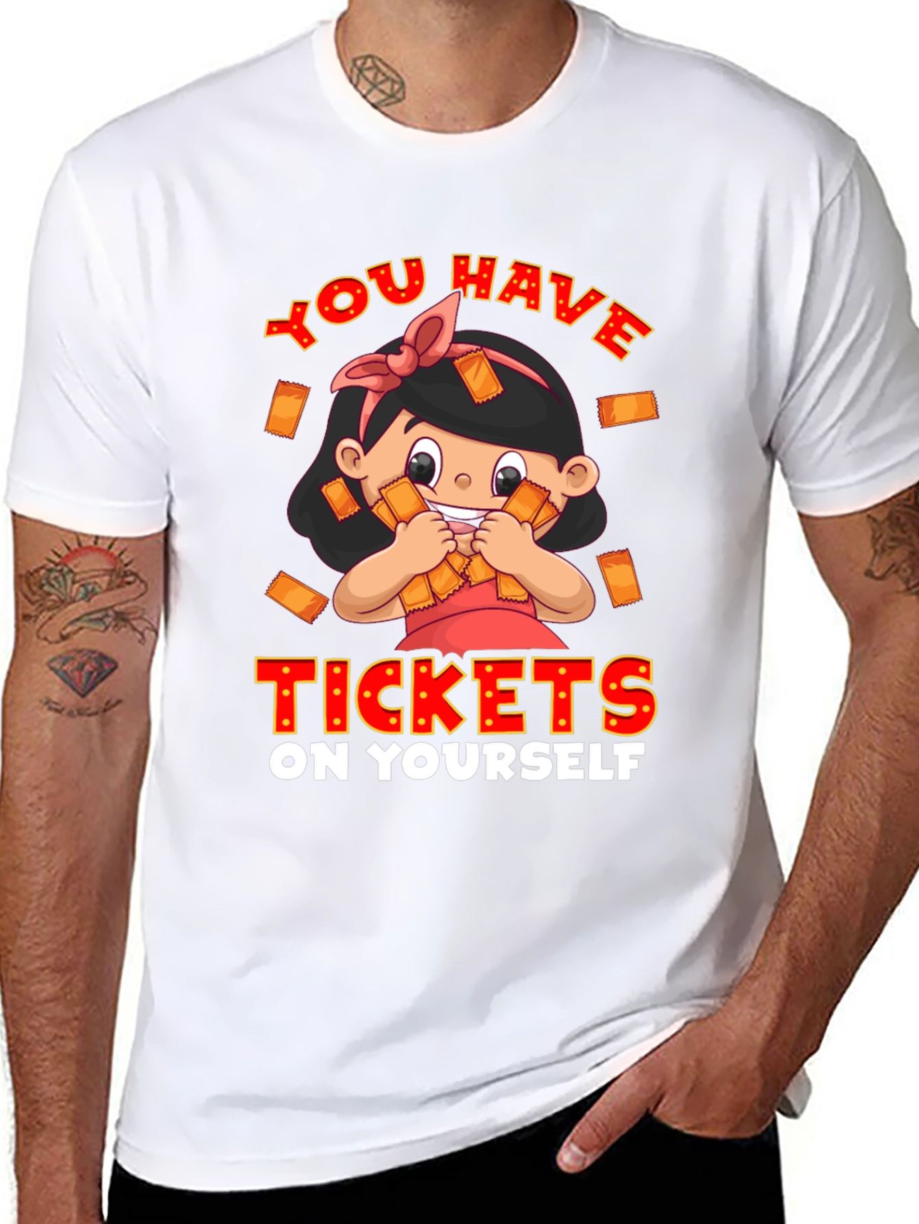 This eye-catching graphic tee features a playful design with a cartoon girl surrounded by tickets, playfully stating "You Have Tickets On Yourself." The vibrant red and orange colors of the graphic pop against the black background, making it a standout piece. Made from a soft, comfortable fabric, this t-shirt is perfect for casual wear and expressing your fun-loving personality. Ideal for everyday outings, parties, or as a unique gift for someone with a great sense of humor. Show off your confidence and playful spirit with this memorable tee!