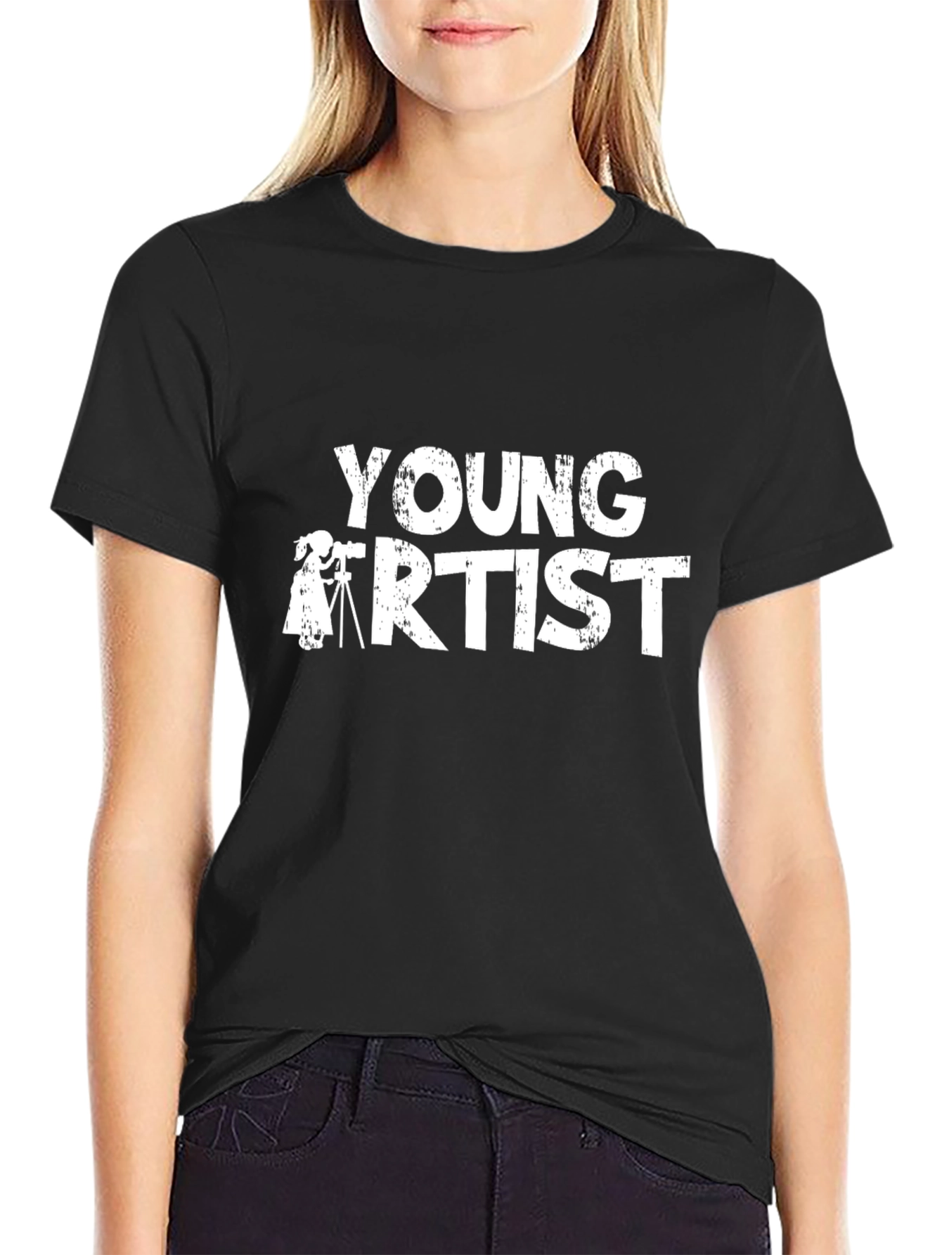Showcase your passion for art with this stylish black t-shirt. Featuring the words "YOUNG ARTIST" in bold white font, this tee is perfect for aspiring and established creatives alike. The design includes a unique graphic element, suggesting photography as an art form. Made from comfortable cotton, it's ideal for everyday wear, art classes, or casual outings. The classic crew neck and short sleeves offer a relaxed fit. Express your artistic spirit with this eye-catching and comfortable t-shirt. A great addition to any artist's wardrobe!