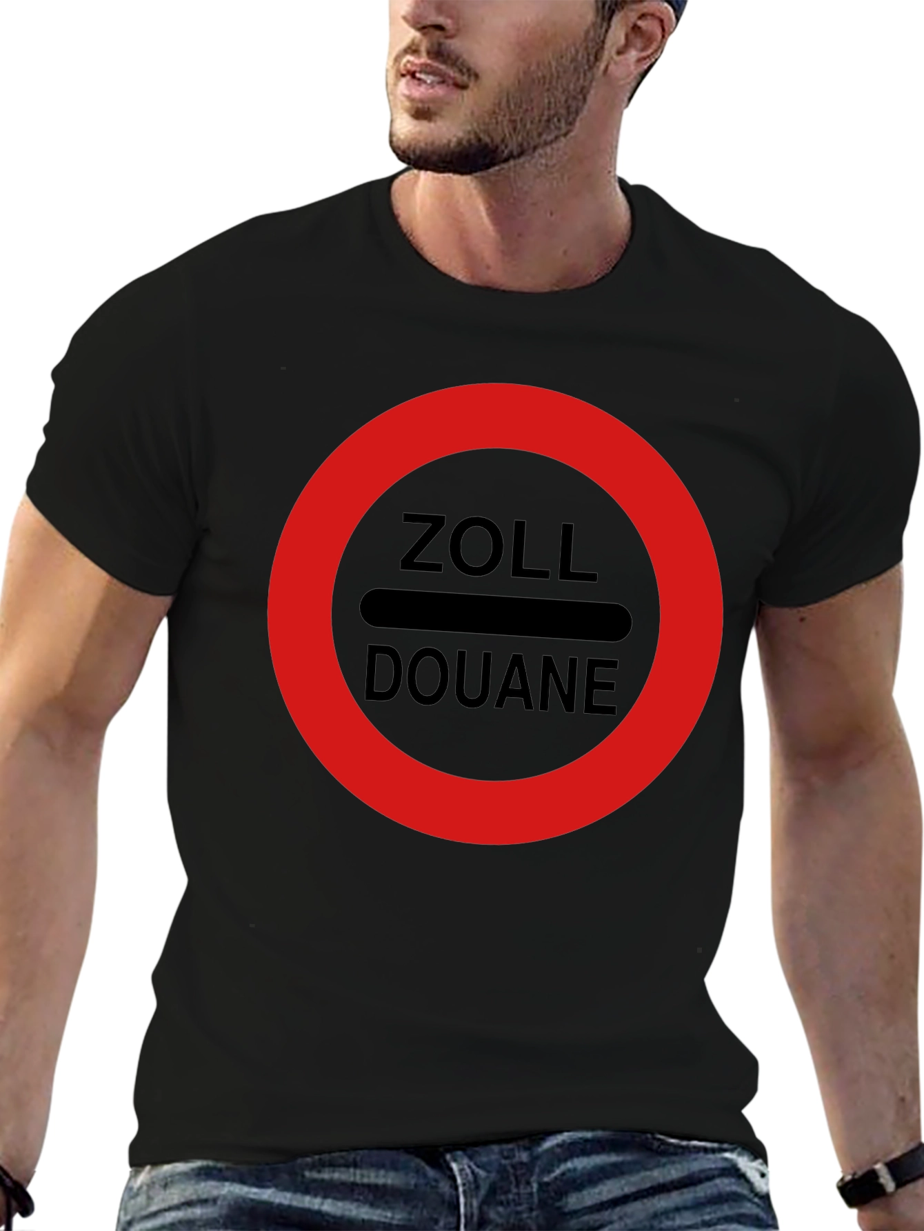 Show your pride with this Zoll Douane T-Shirt. This stylish black tee features a bold, red circular design with 'ZOLL' and 'DOUANE' printed in clear lettering. Perfect for customs officers or anyone with an interest in customs and border protection, this shirt is sure to make a statement. The design is printed on what looks to be a comfortable cotton fabric, making it ideal for everyday wear. This unique t-shirt is a great way to express your identity or a fun gift for colleagues, friends, or family members.