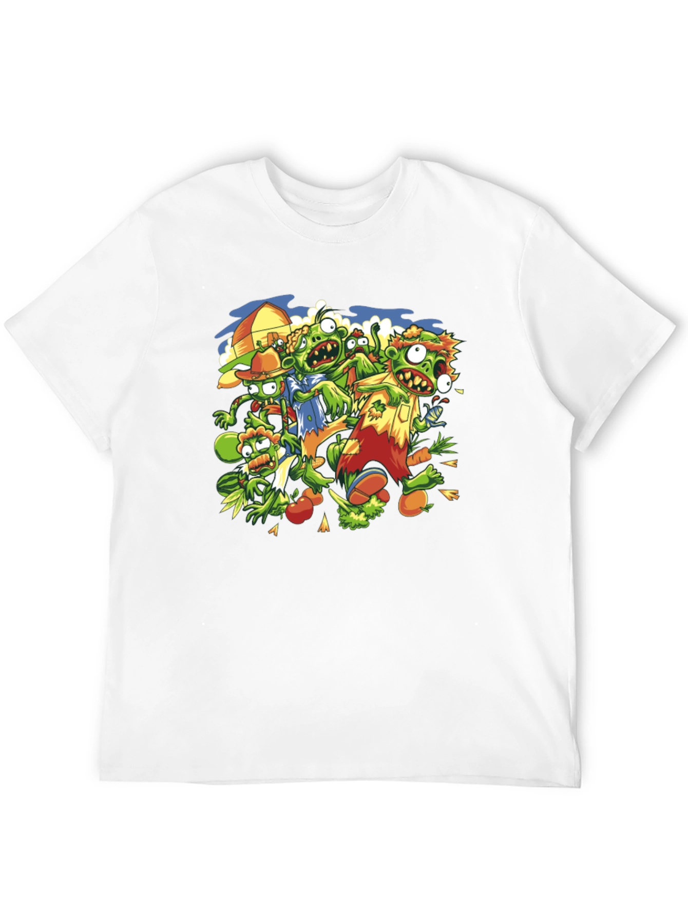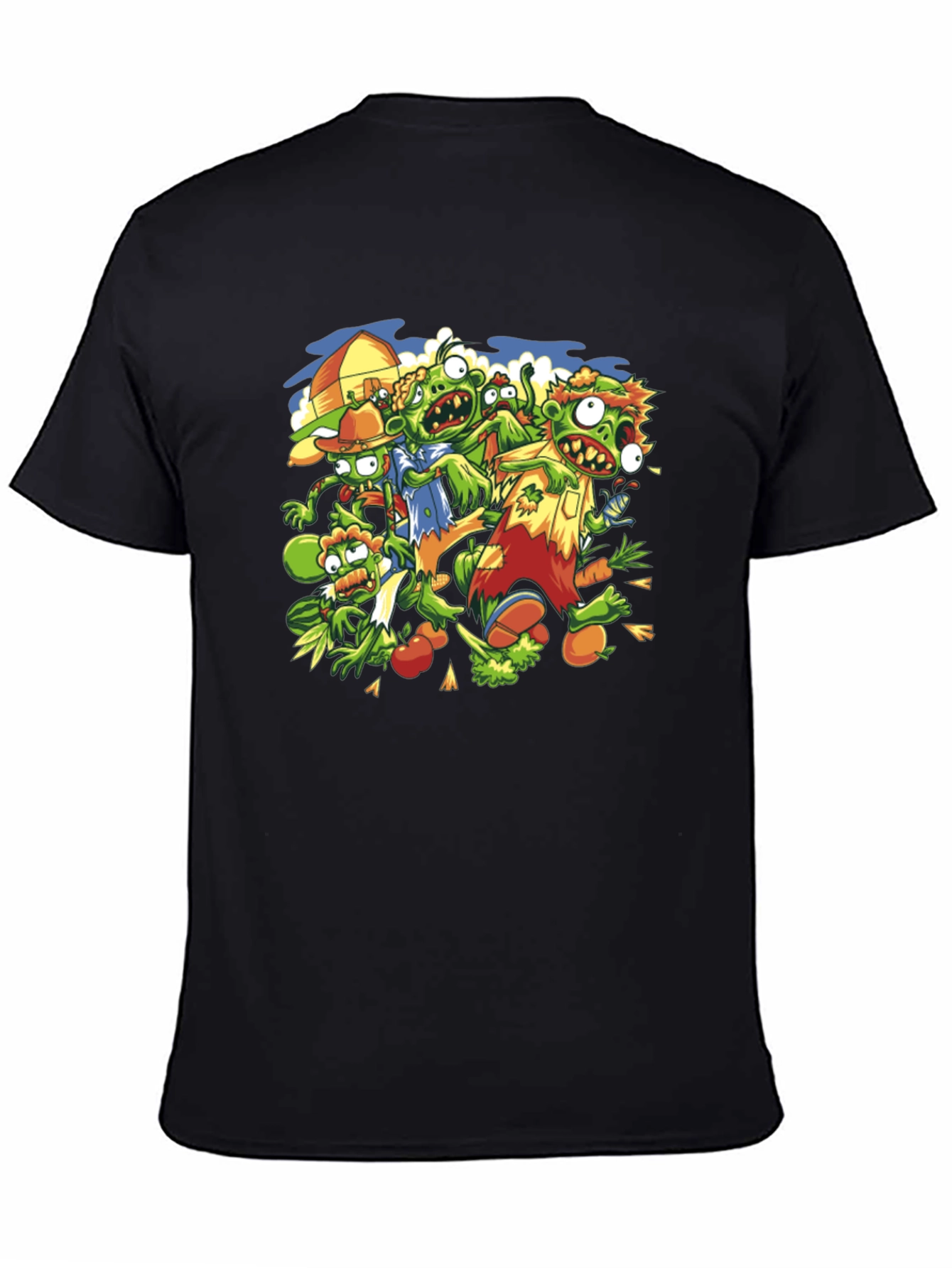 Show off your quirky sense of humor with this eye-catching black t-shirt! Featuring a colorful and detailed graphic of zombie vegetables wreaking havoc, this tee is sure to turn heads. The print showcases a lively scene with various zombified veggies in a cartoon style, set against a dynamic backdrop. Made from a comfortable-looking fabric, this t-shirt appears ideal for everyday wear. The dark color provides a versatile base for the vibrant design, ensuring it pops. Perfect for casual outings, comic conventions, or just lounging at home, this zombie veggie tee is a must-have for fans of quirky and humorous apparel. Add some fun to your wardrobe!
